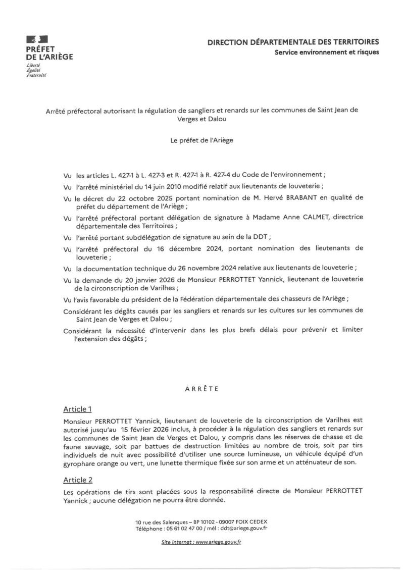 Arrêté Préfectoral autorisant la régulation de sangliers et renards